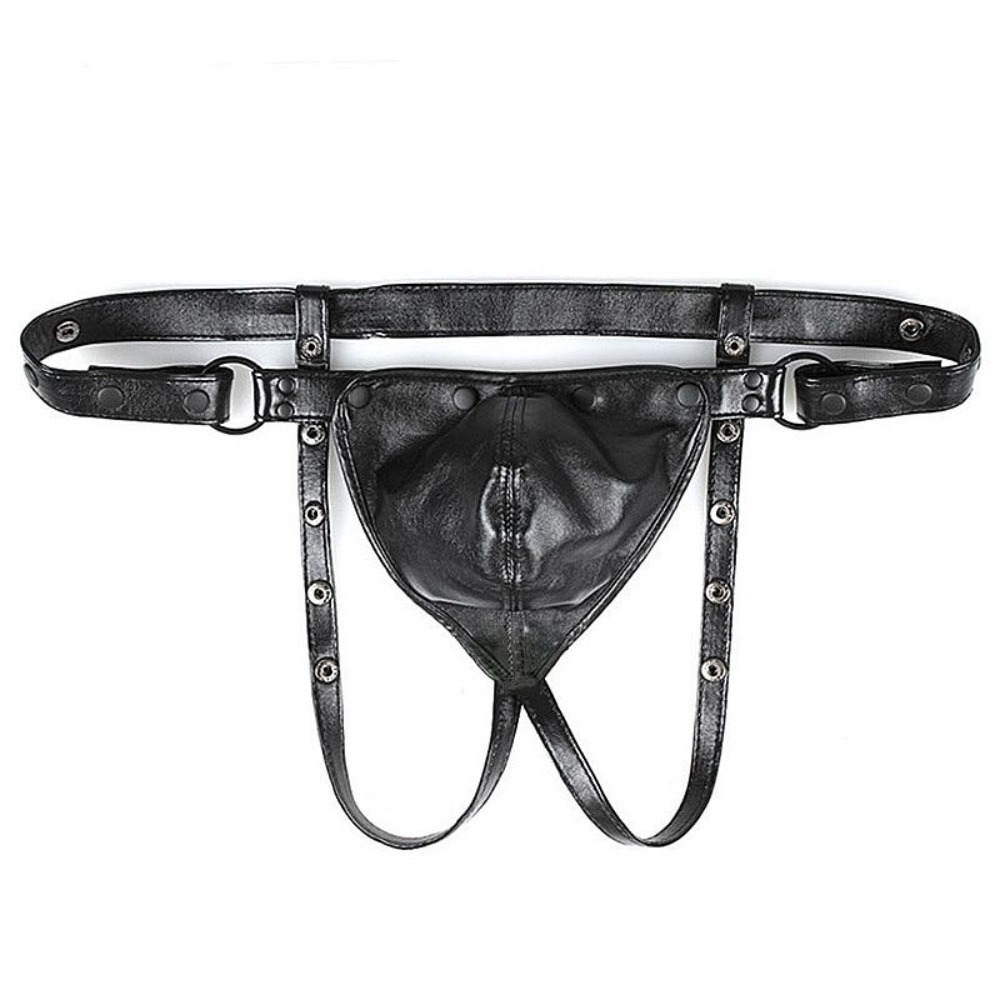 É um cinto masculino em couro com formato de cueca ajustável. Mantenha seu parceiro dominado com este resistente cinto de castidade.