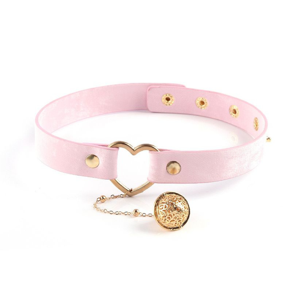 Coleira bondage ajustável por meio de fivelas metálicas, confeccionada em couro sintético.