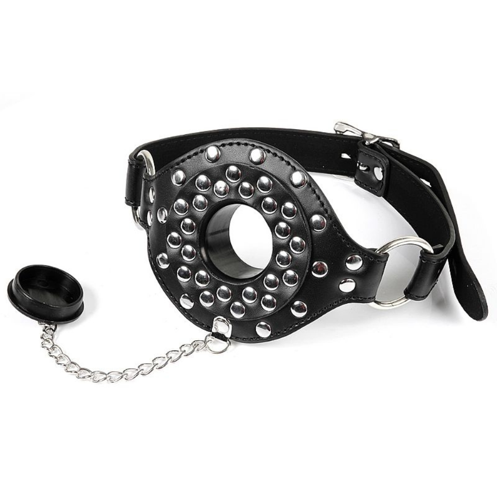 Mordaça bondage ajustável por meio de fivelas metálicas, confeccionada em couro sintético.