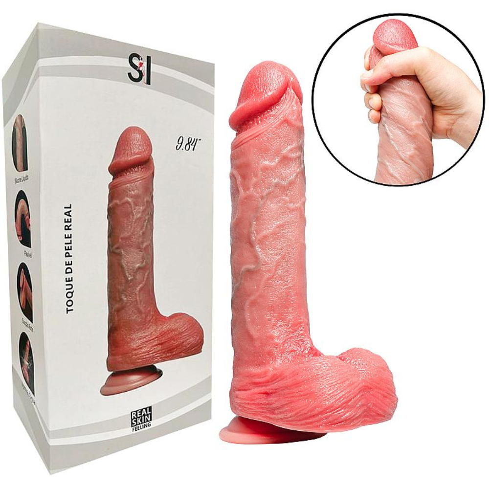 Pênis realístico, confeccionado em silicone. possui glande definida, textura de veias, escroto e ventosa para penetrações em ângulo reto.